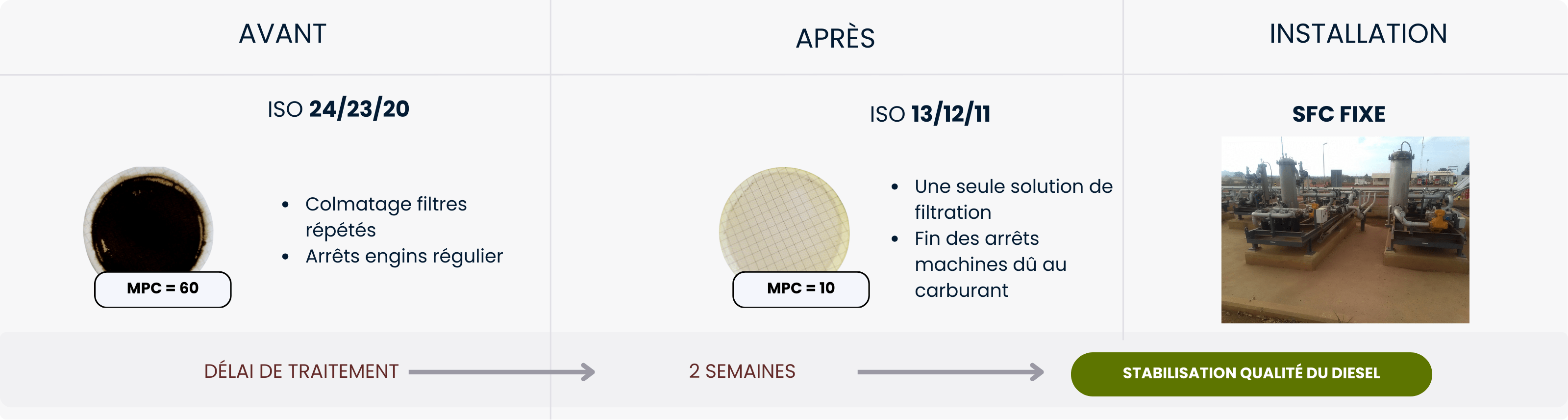 Stabiliser, déshydrater et filtrer le diesel en conditions poussiéreuses, humides et fortement sollicitées.