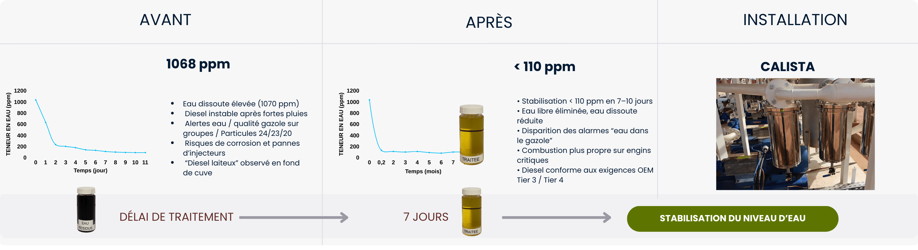 * Condensation & stockage long * Développe bactéries, champignons, boues → Objectif: <200ppm en un seul passage (Calista)